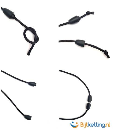 Alle våre tyggesmykker er utstyrt med smykkesnor. Disse er vanligvis laget av nylon eller sateng for beste komfort. Selvfølgelig kan det være at lengden på snoren blir akkurat litt feil for deg. Heldigvis er det lett å lage den kortere!